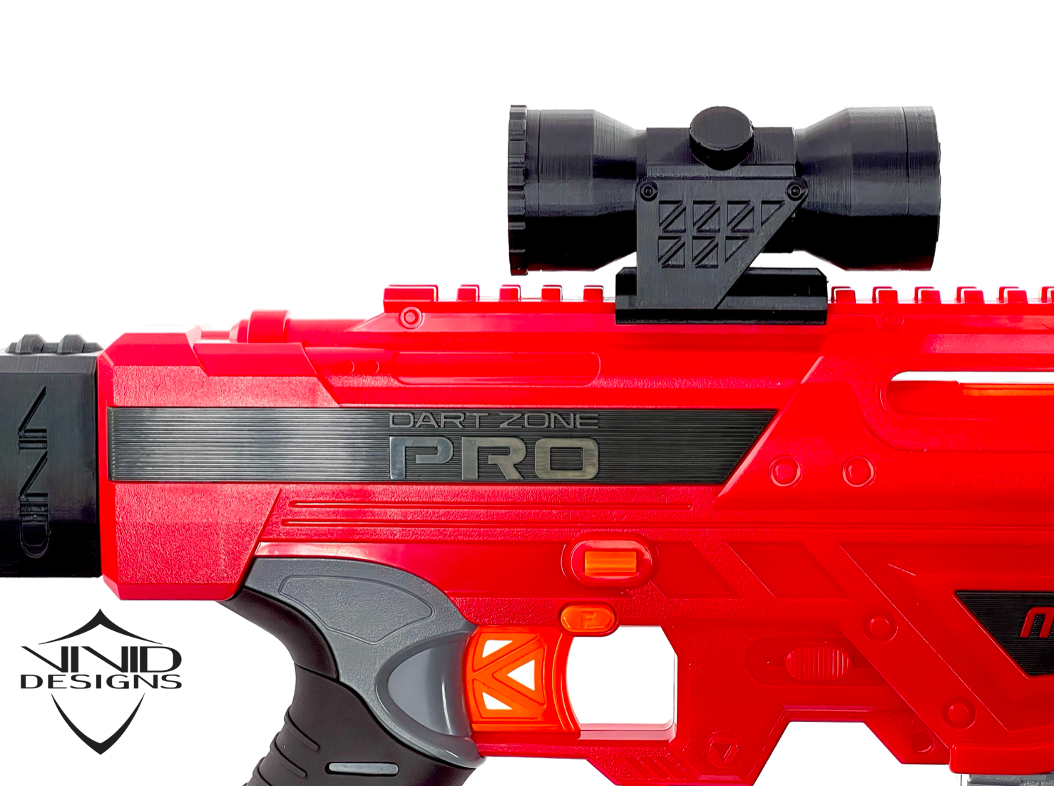 Introducing, the scope engineered by Vivid Designs! This scope is compatible on the Dart Zone MK 1.2, DZ Max Stryker 2.0, Venom Pro, Adventure Force Nexus Pro and AF Conquest Pro. Scope included. Other components sold separately. It has a mechanism that when slid on the rail, it clicks into the groves and stays put. No hardware needed. The scope also features cross hairs that give it a classic look when aiming through it. As an added bonus, it looks really cool. This is made with Premium PLA on high precision machines. It comes in the color: The Dark Night Black. Enjoy!